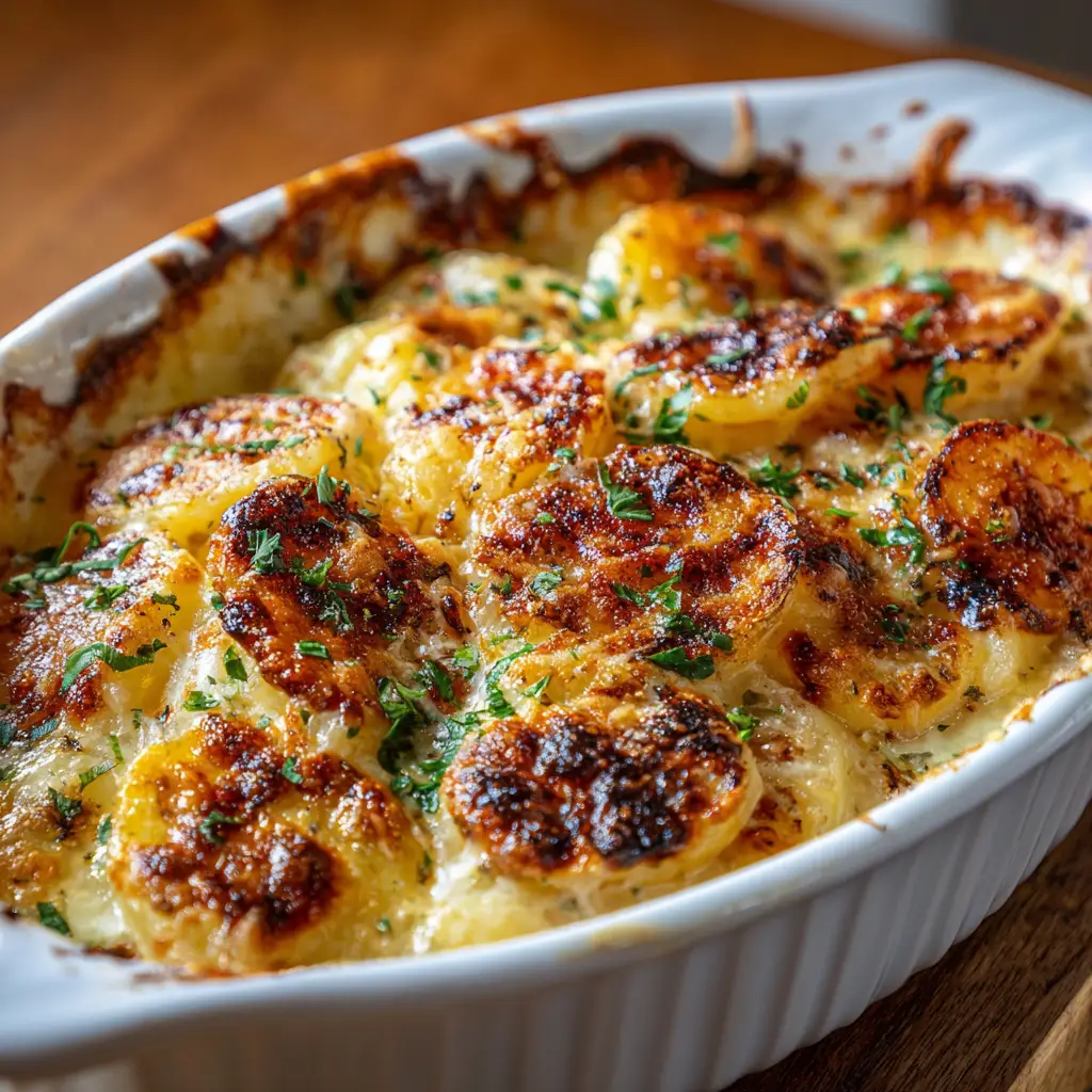 Au gratin potatoes are a timeless comfort dish known for their creamy texture and rich baked flavor. Thinly sliced potatoes are layered with a smooth cheese sauce and baked slowly until soft inside and beautifully golden on top. Each bite feels indulgent yet familiar, making this dish a favorite at family dinners and festive gatherings.